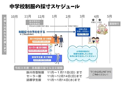 ※「掛川市型制服」「セーラー服」「詰襟学生服」の採寸期間がそれぞれ異なります。ご予約の際は、ご注意ください。