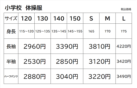■小学校体操服 料金表